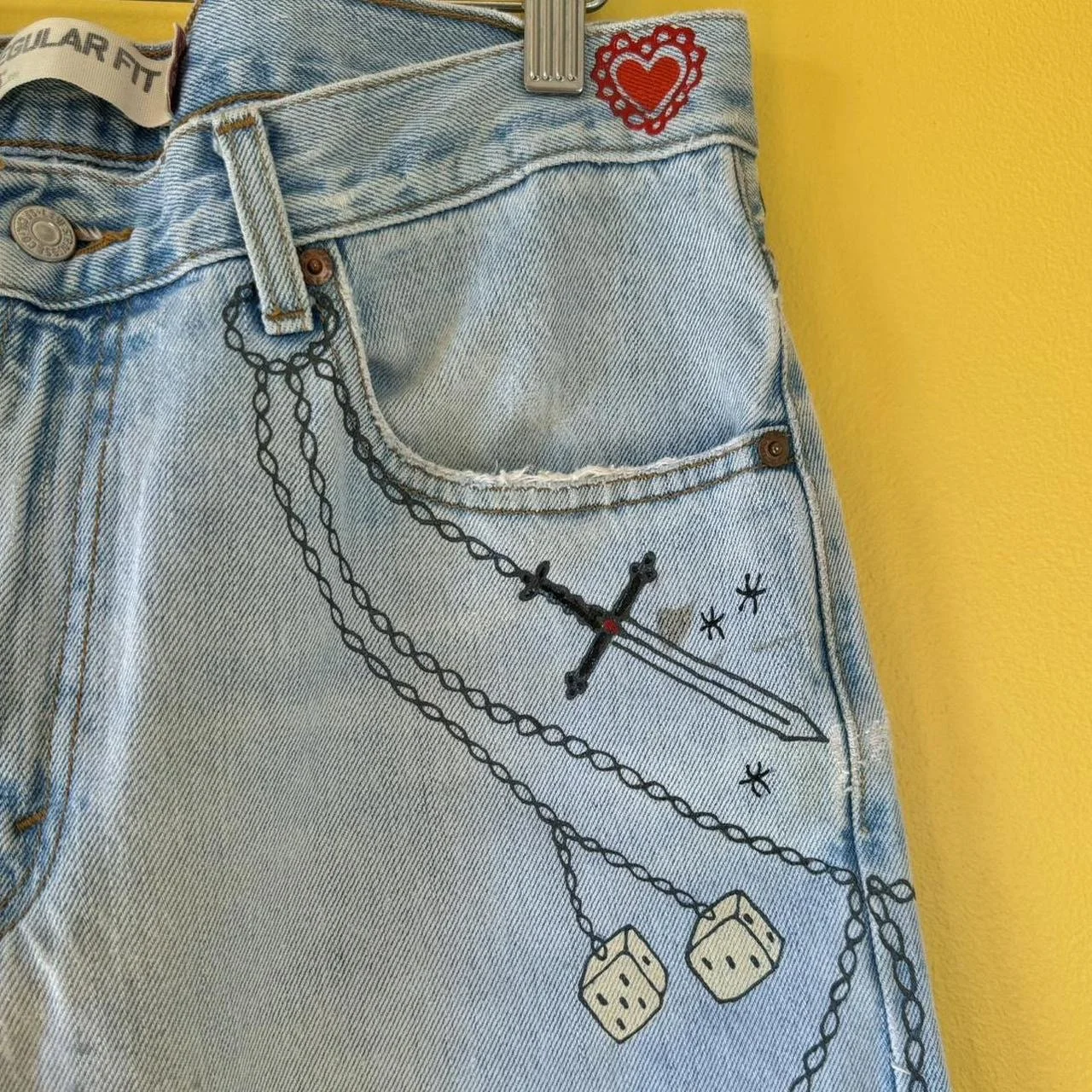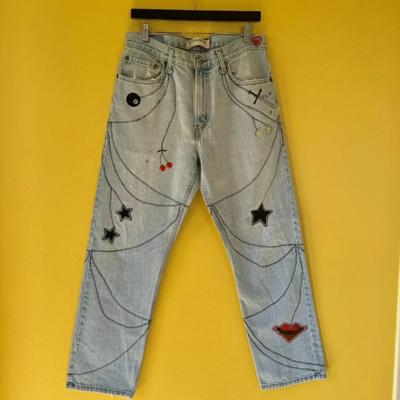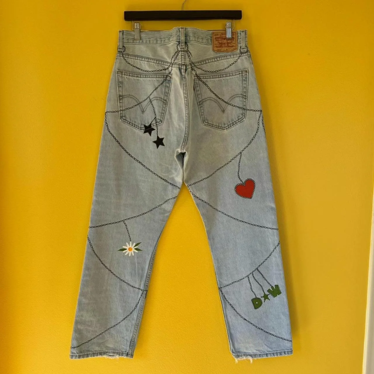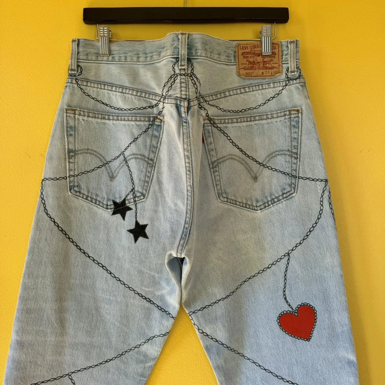 DAISY WORLD GOODIES › OL' BALL & CHAIN PANTALOON Image 1 of 5 Image 2 of 5 Image 3 of 5 Image 4 of 5 Image 5 of 5 OL' BALL & CHAIN PANTALOON $200.00 hand painted vintage 505 levi’s when purchased you can send me two different words to write in the hearts!!!!32x30 Purchase Added! hand painted vintage 505 levi’s when purchased you can send me two different words to write in the hearts!!!!32x30